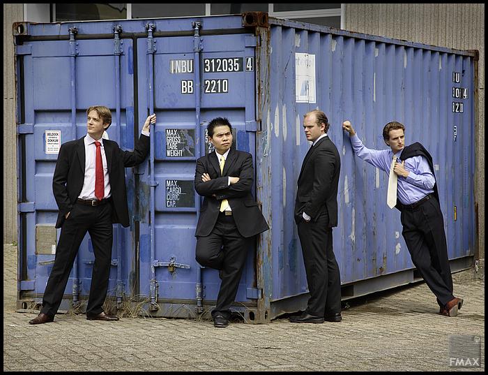 met de armen over elkaar, glimmend van trots in hun gloednieuwe kantoor,